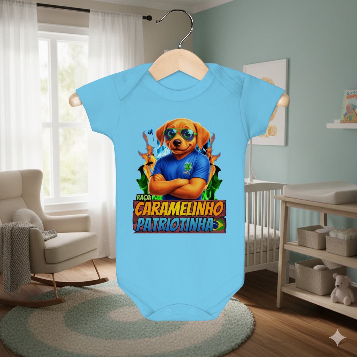Vista o seu tesouro com o carisma e o orgulho nacional do nosso body "CARAMELINHO PATRIOTINHA"! É a forma mais fofa, divertida e confortável de apresentar seu bebê ao amor pelo Brasil.