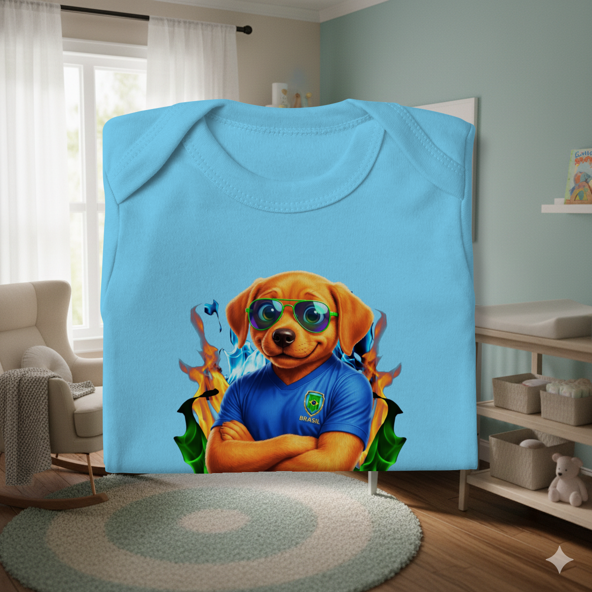 • Primeiros Passos Patriotas: O design alegre, com o Caramelinho de óculos de sol e camiseta azul, torna o ato de vestir o bebê emocionante e honroso, prestando tributo a este heróizinho canino que é ícone nacional.