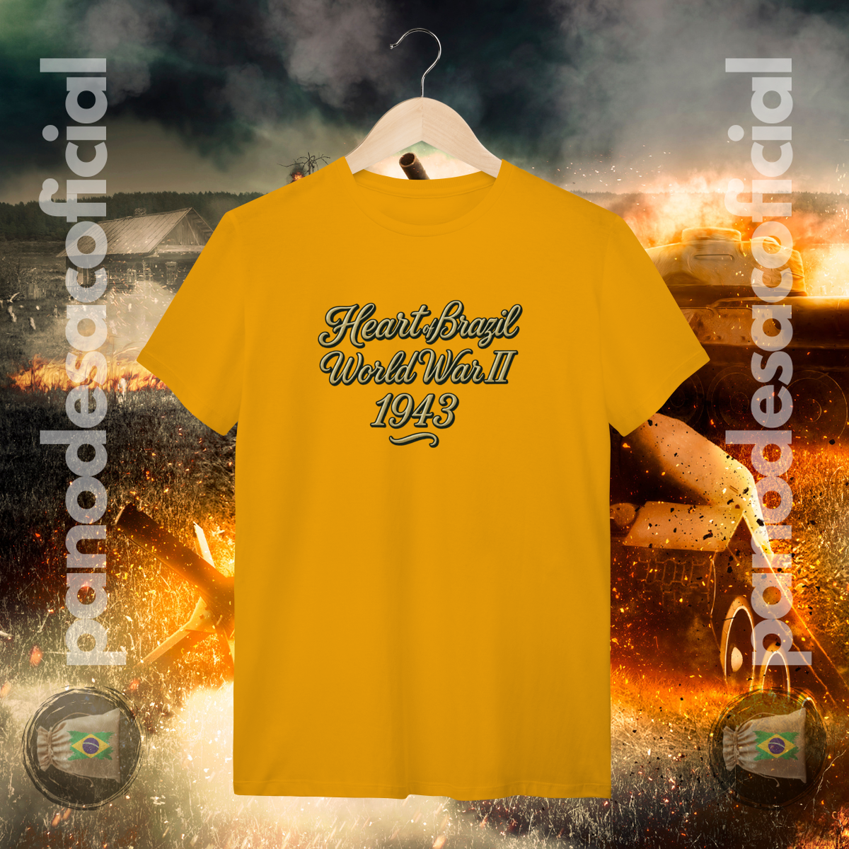 Esta camiseta apresenta o brasão "Coração do Brasil", um dos primeiros distintivos utilizados pelos nossos "pracinhas" (soldados da FEB) em 1943 e no início da campanha na Itália, por volta de 1944.