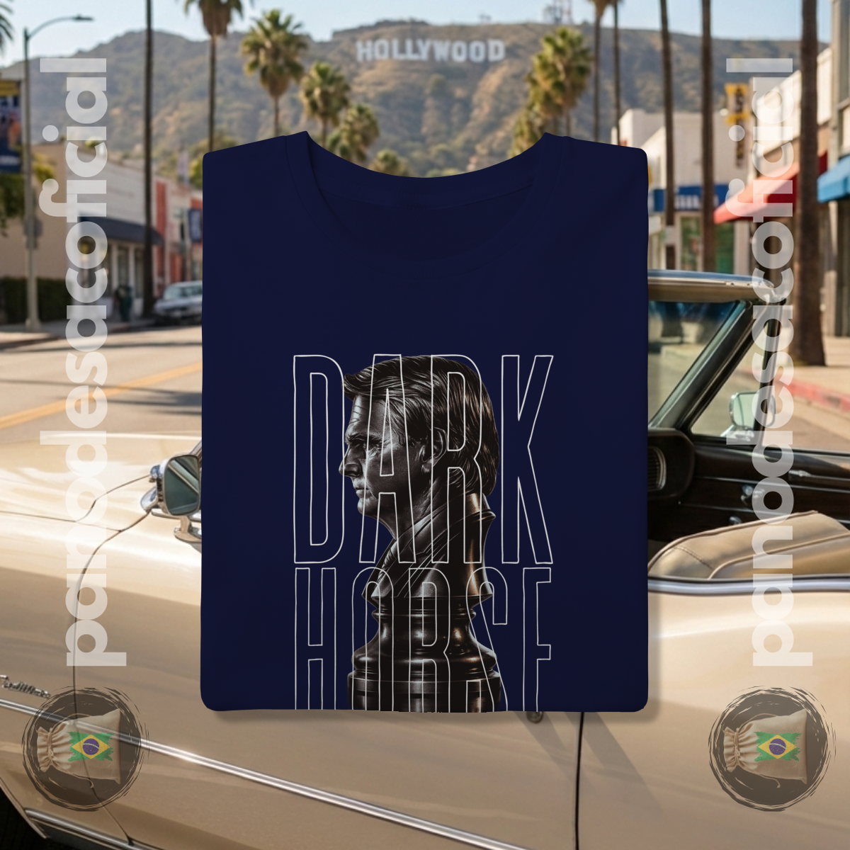 A estampa, em estilo busto escultural, captura a essência do termo norte-americano "Dark Horse": aquele candidato subestimado, o azarão que ninguém viu chegar, mas que surpreendeu de forma excepcional.
