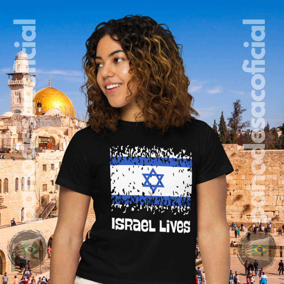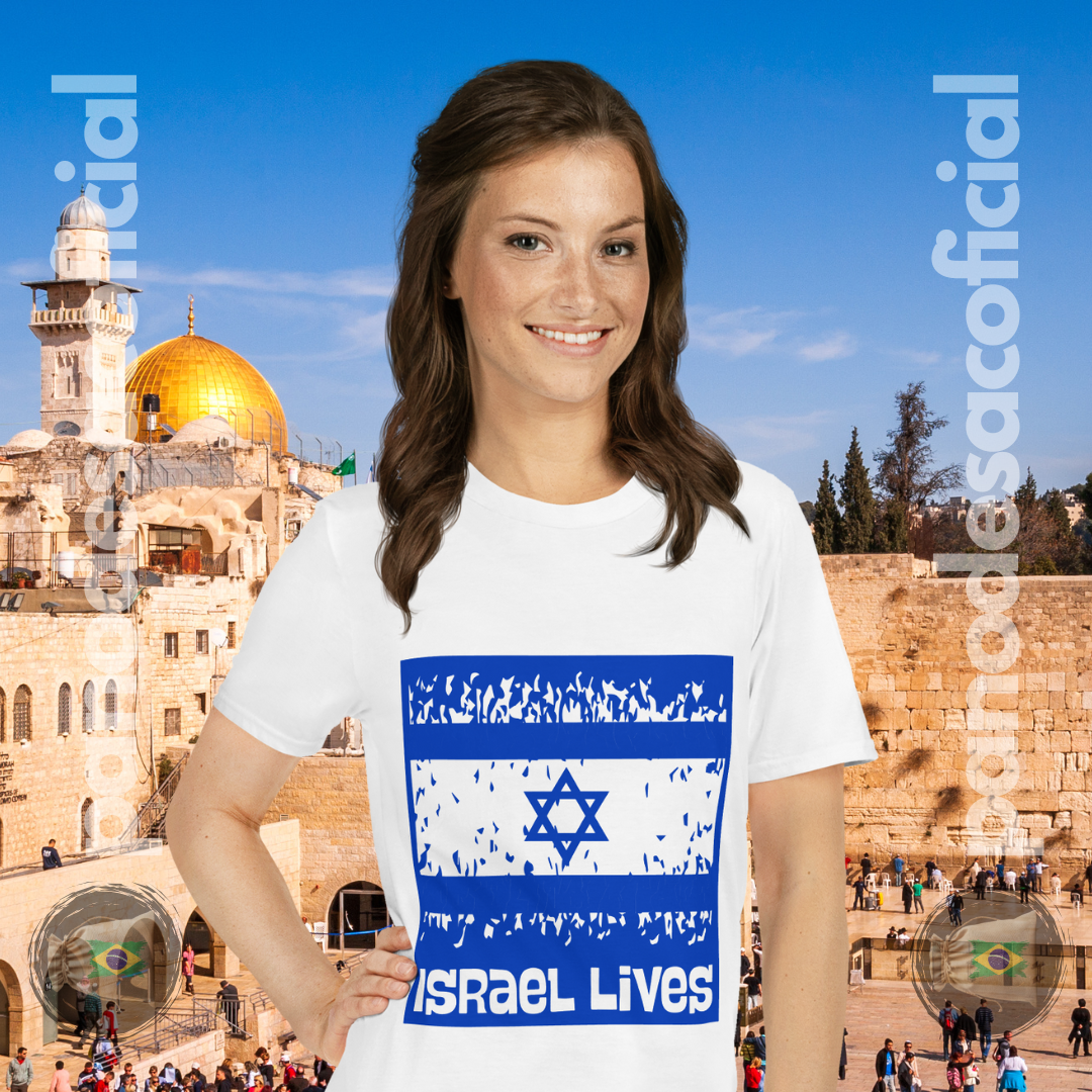 Vista uma poderosa declaração de apoio e fé na resiliência milenar de Israel com a camiseta "Israel Lives". Esta estampa vibrante celebra a permanência e a força de uma nação que, apesar de perseguições e ataques, permanece inabalável.