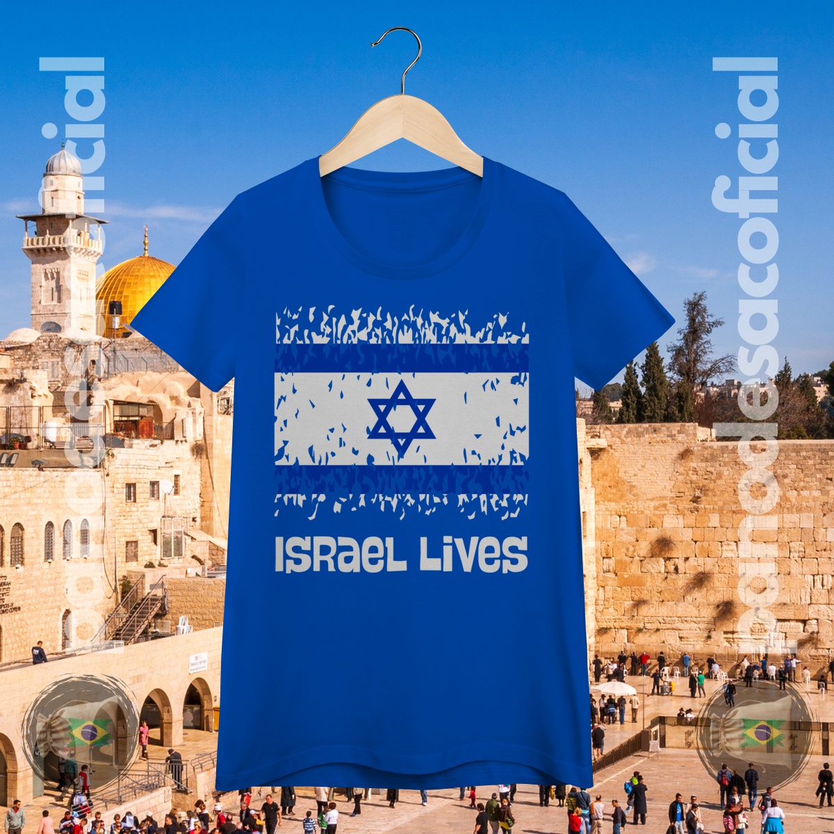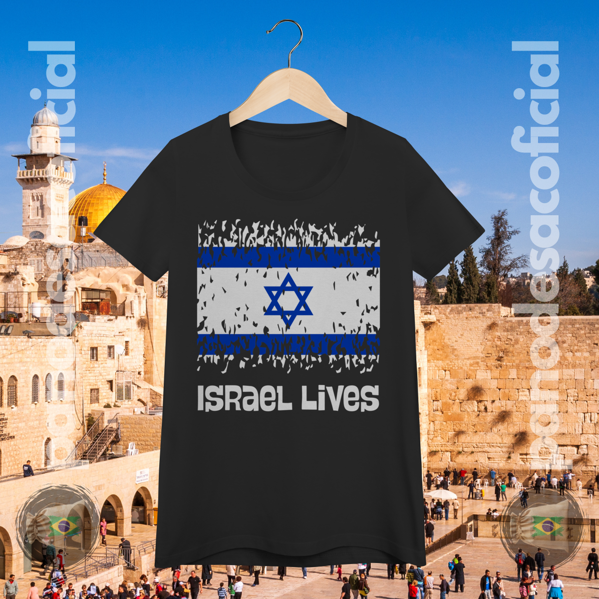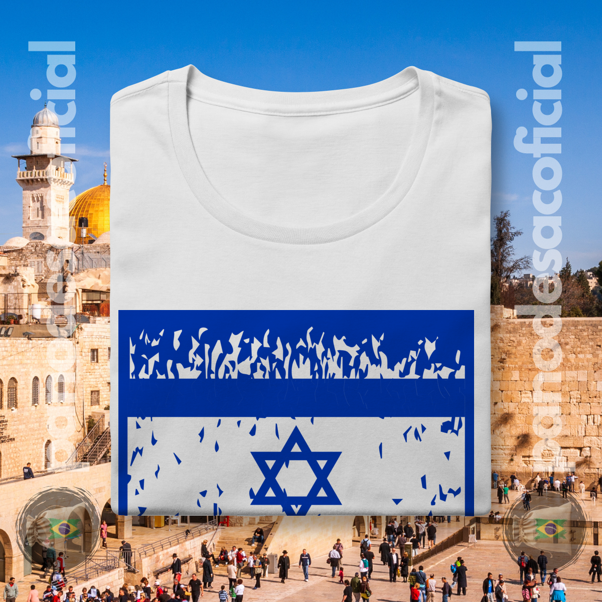 O design apresenta a Bandeira de Israel com uma textura distressed (desgastada), simbolizando a luta milenar e as adversidades históricas enfrentadas. A mensagem é clara: