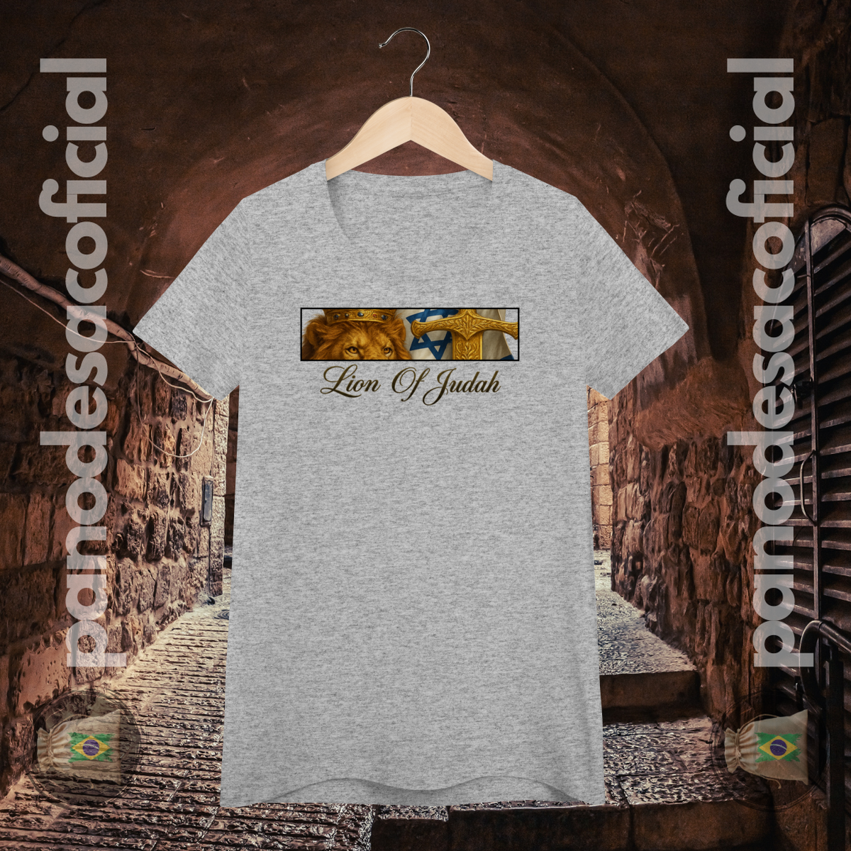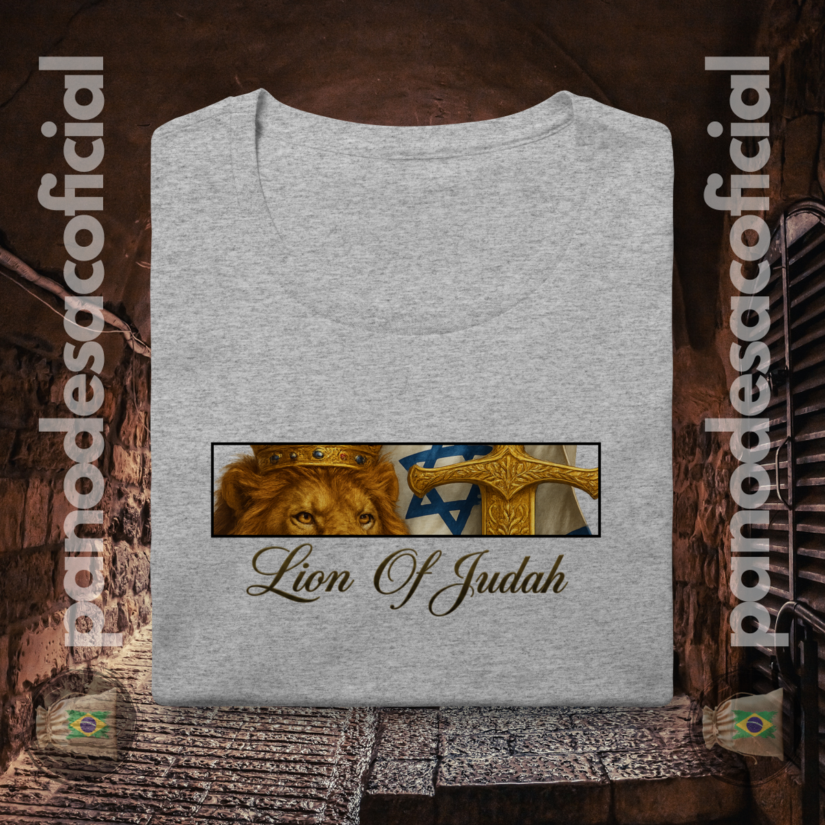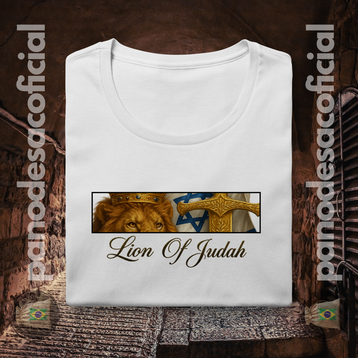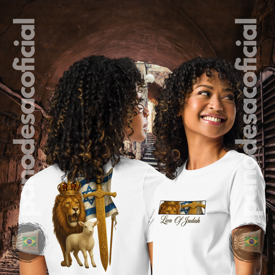 Vista uma das mais poderosas imagens da fé judaico-cristã com a camiseta "Lion of Judah". Esta arte profunda e simbólica celebra o legado do Leão da Tribo de Judá, o Messias, em Sua dupla natureza.
