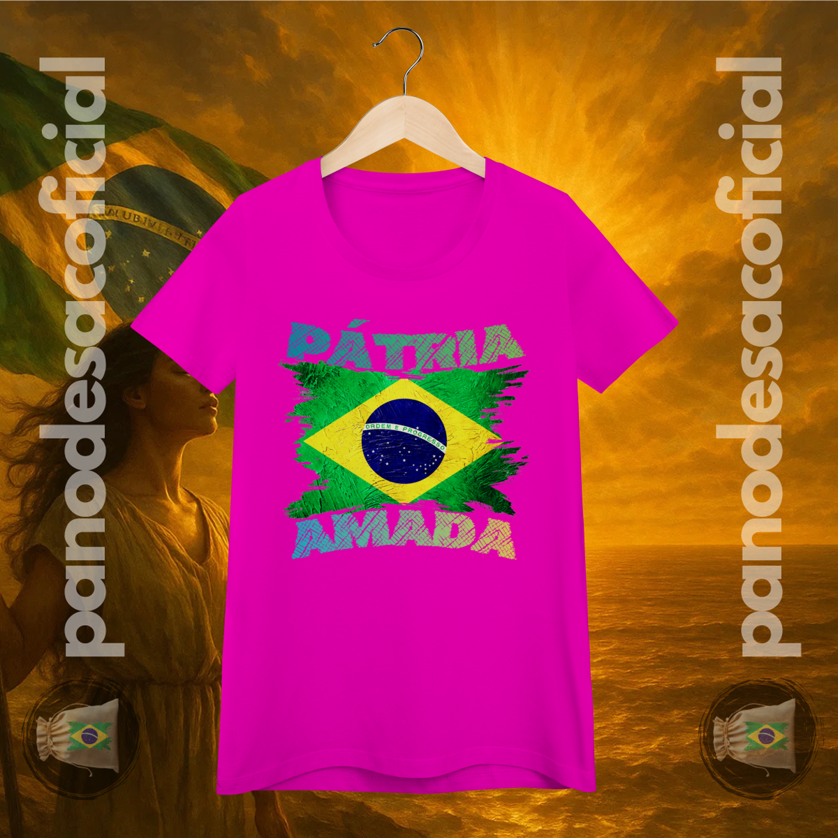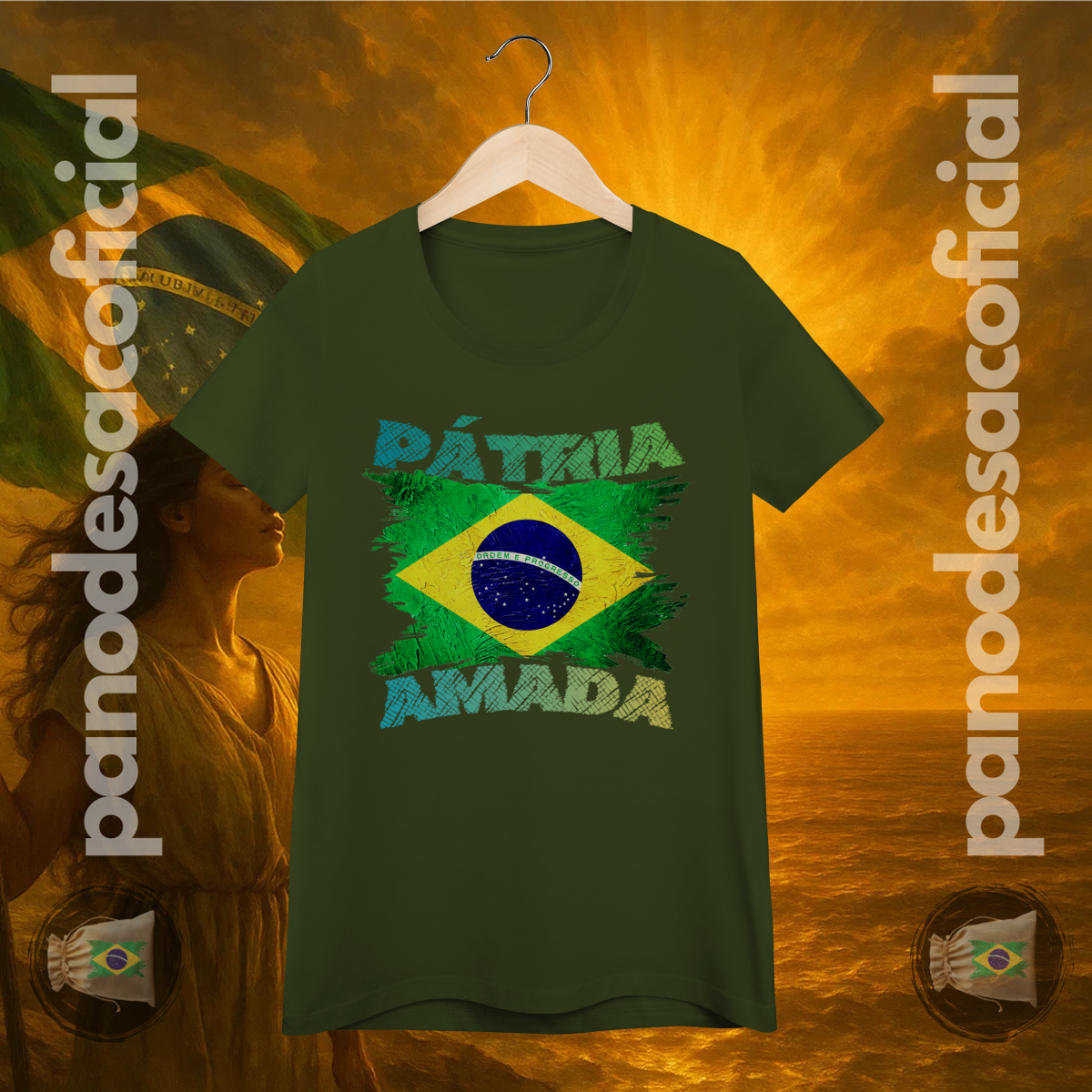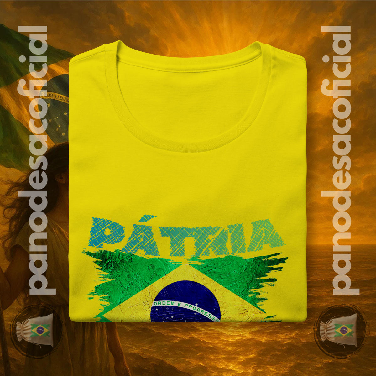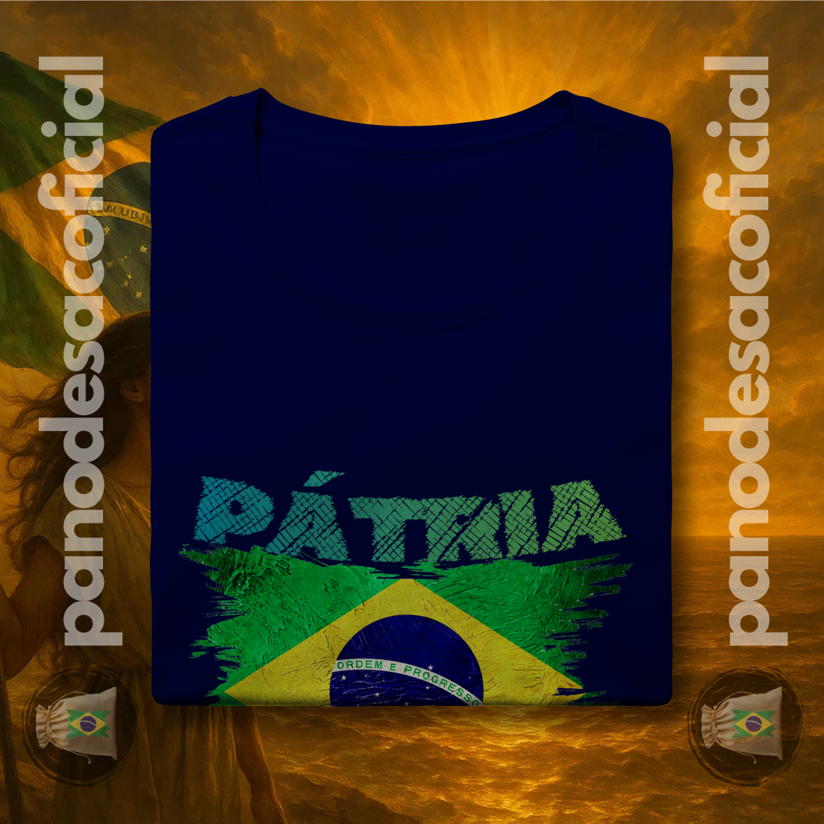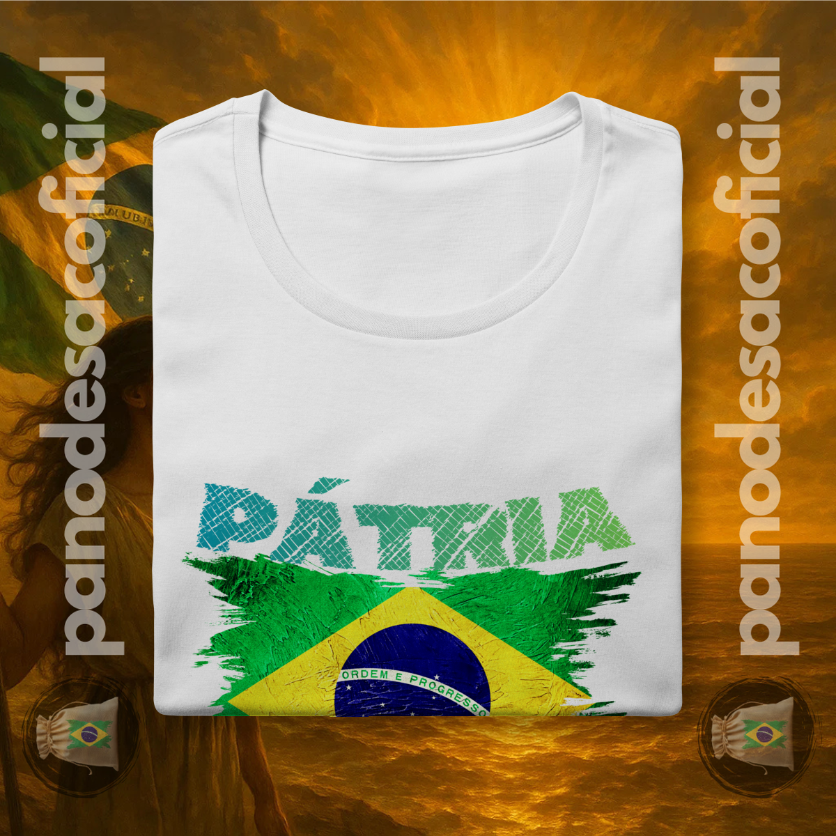Com a bandeira nacional em um design vibrante e texturizado, e a poderosa frase "PÁTRIA AMADA" em destaque, você veste no peito sua atitude de cidadão de bem.