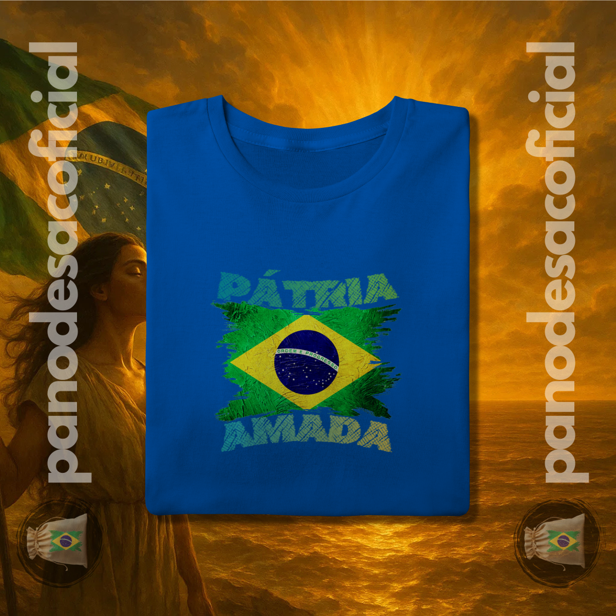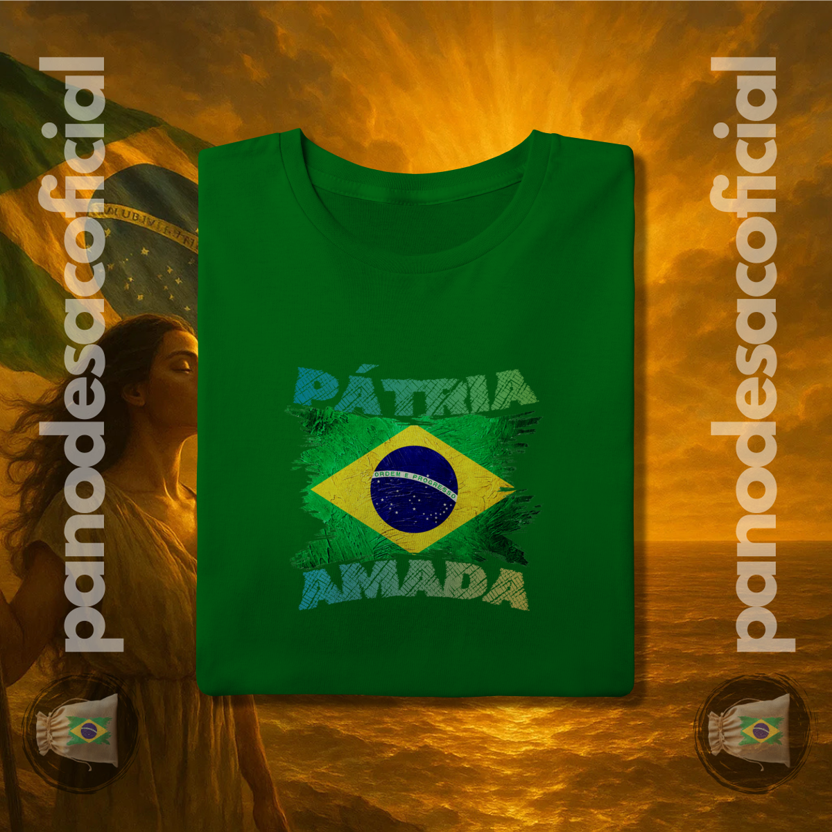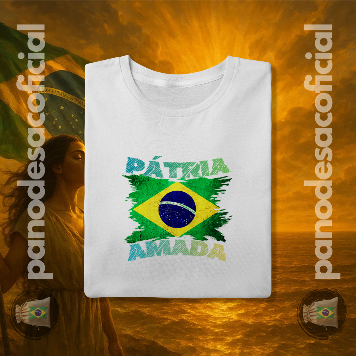 Com a bandeira nacional em um design vibrante e texturizado, e a poderosa frase "PÁTRIA AMADA" em destaque, você veste no peito sua atitude de cidadão de bem.