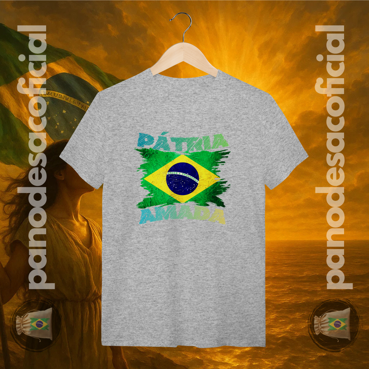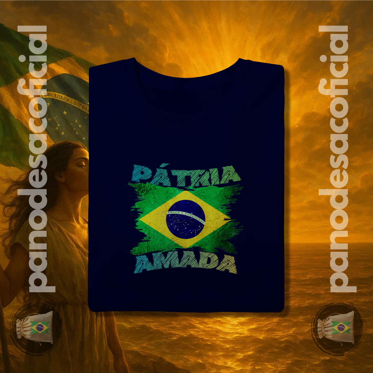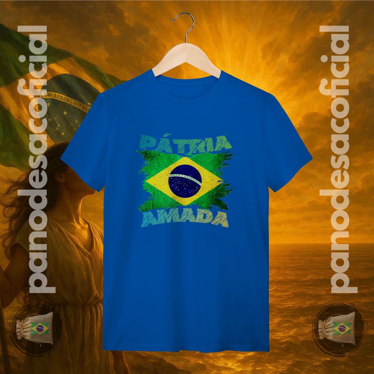 Com a bandeira nacional em um design vibrante e texturizado, e a poderosa frase "PÁTRIA AMADA" em destaque, você veste no peito sua atitude de cidadão de bem.