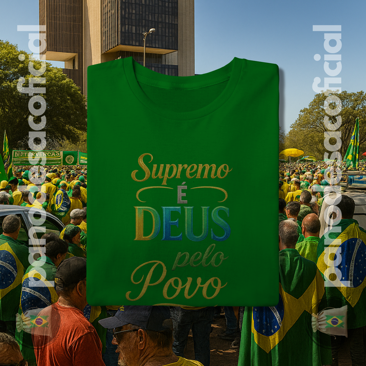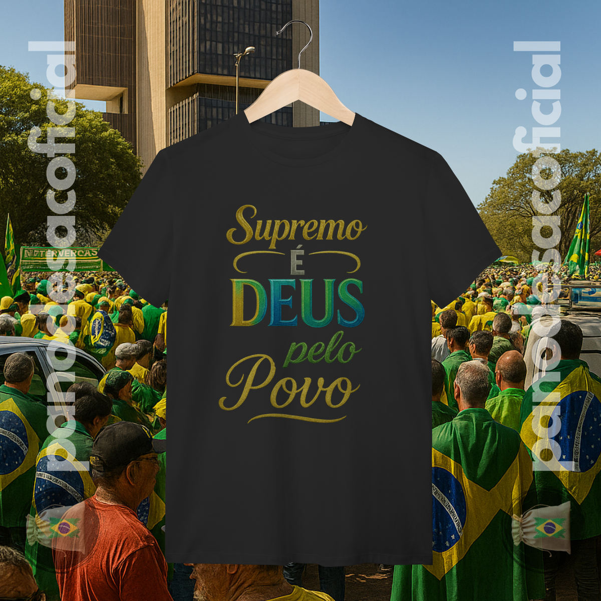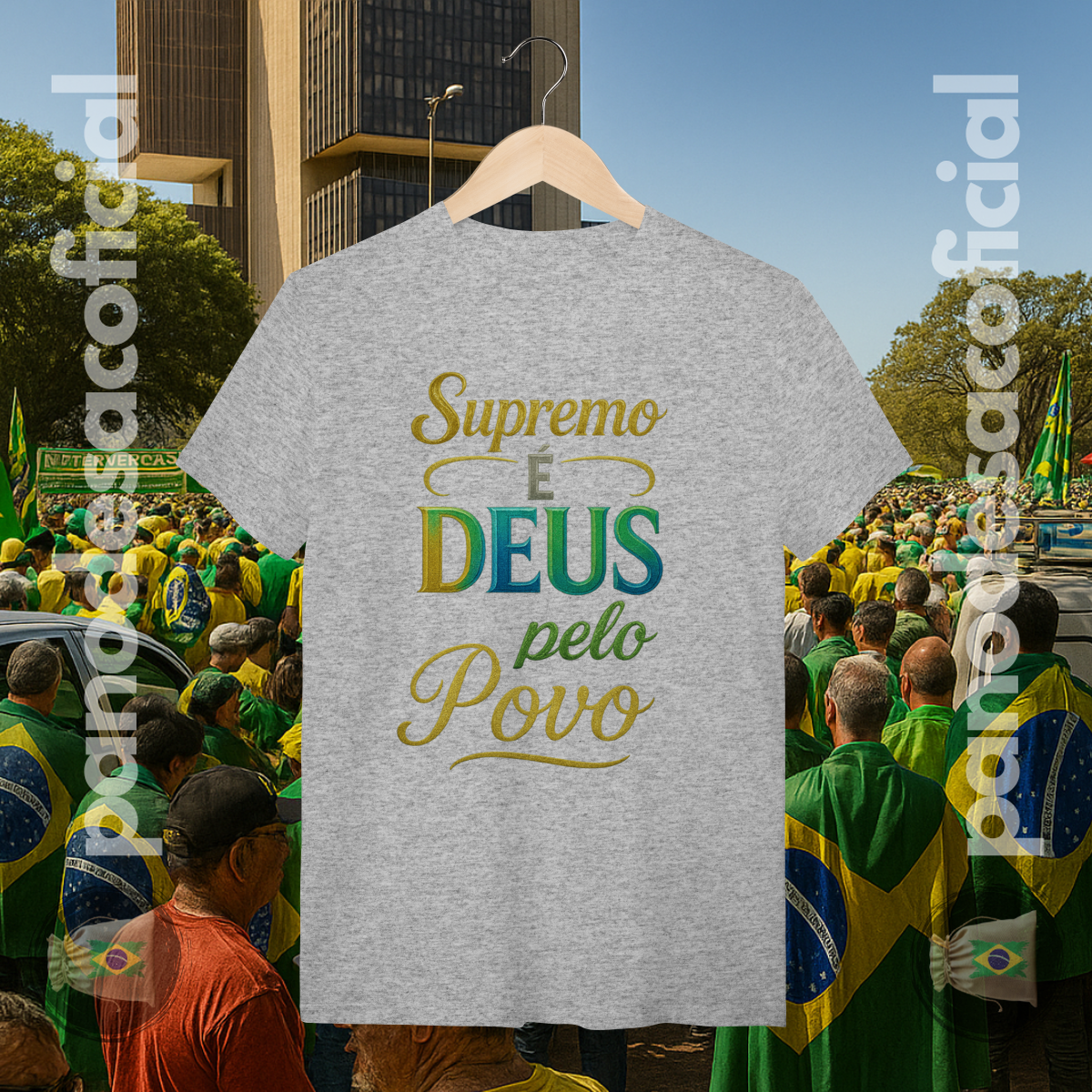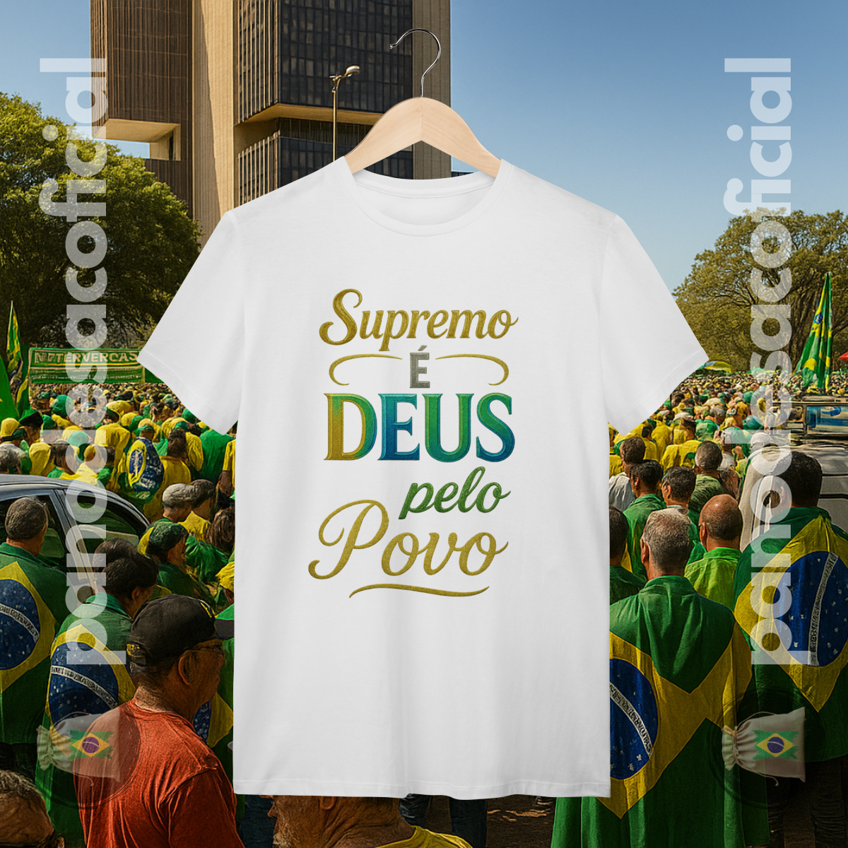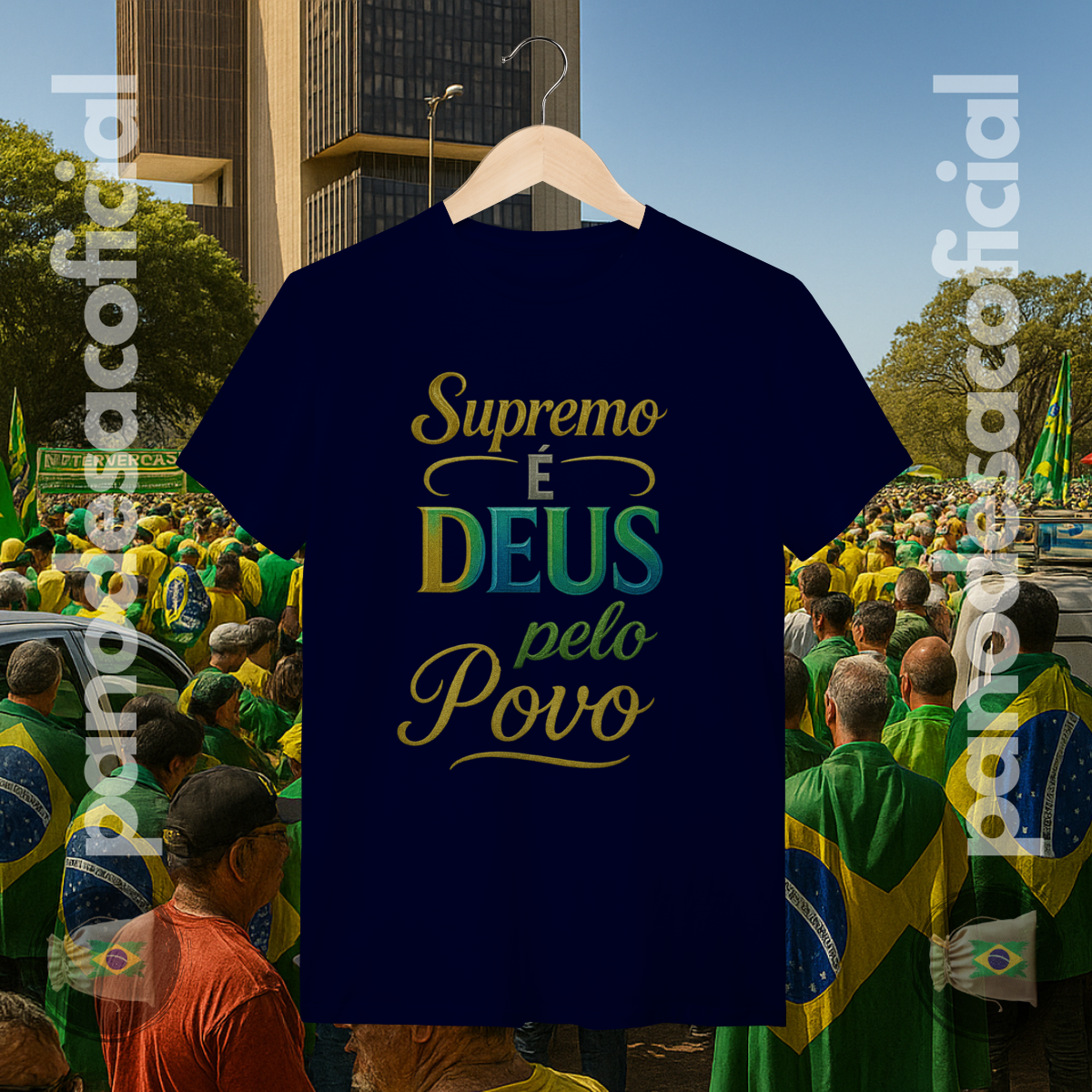 Vista uma declaração de fé e verdade com a nossa camiseta "SUPREMO É DEUS pelo Povo". Esta estampa é um manifesto poderoso sobre a soberania divina e o alicerce espiritual de uma nação.